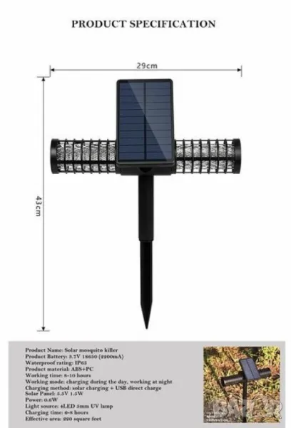Соларна лампа против комари. Материал - здрава пластмаса и ел. компоненти. Обхват - 1-2 акра. Литиева батерия 18650. Капацитет на батерията 3.7 V, 2000 mAH. Сертификат за водоустойчивост IP65. Издръжливост - до 10 часа. Светлинен източник 4 бр х 5 мм UV и LED диодни крушки. Възможност за зареждане на ток чрез USB кабел. Безшумна. Копче ON/OFF. Вградена предпазна решетка. Комплектът включва - 1 бр. лампа срещу комари, 2 бр. тръби на държащо рамо, 2 бр. винт, 1 бр. кабел за зареждане, 1 бр. стойка-планка за стена и ръководство за употреба. Гаранция - 12 месеца.