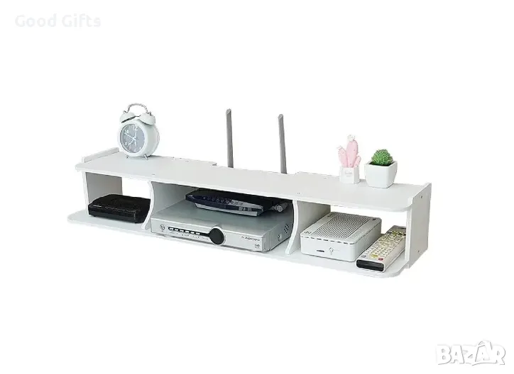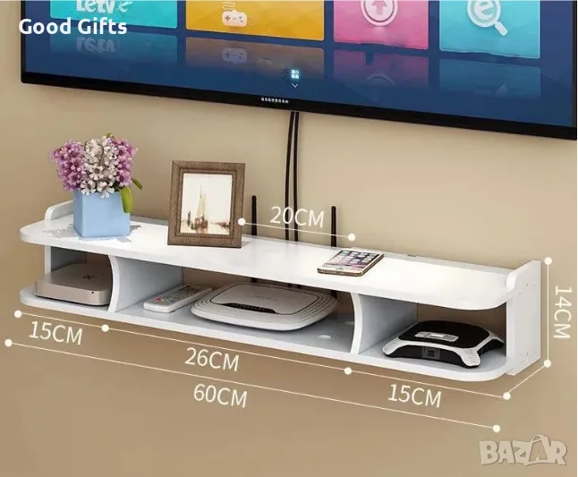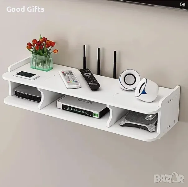 Практичен и стилен стенен ТВ рафт, идеален за организиране на вашите устройства и аксесоари под телевизора. Изработен от лек и здрав материал, в елегантен бял цвят, който се вписва във всеки интериор.