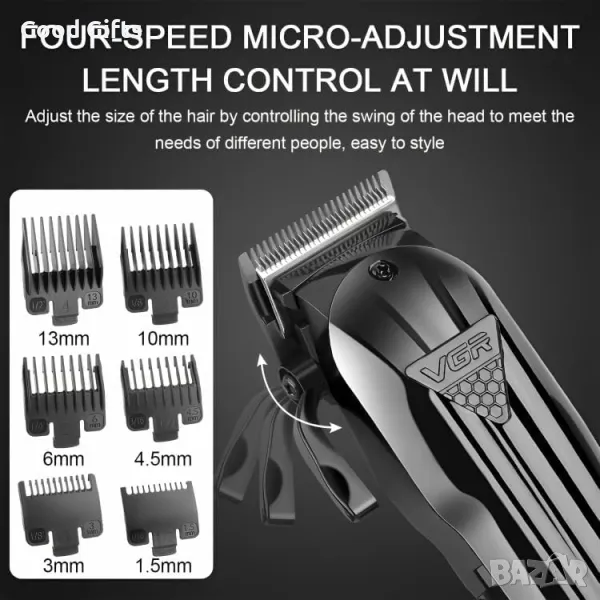 Професионалната машинка за подстригване VGR V-282 впечатлява с елегантен черен дизайн, здрава конструкция и модерни функции. Подходяща е както за домашна, така и за салонна употреба, осигурявайки чисто и гладко подстригване всеки път.