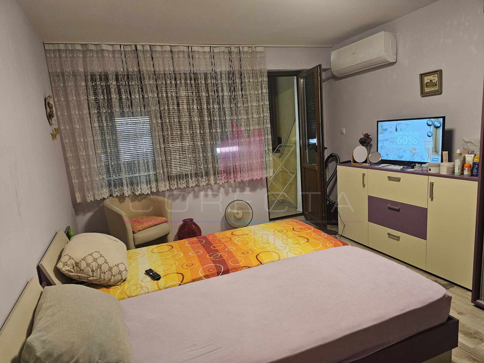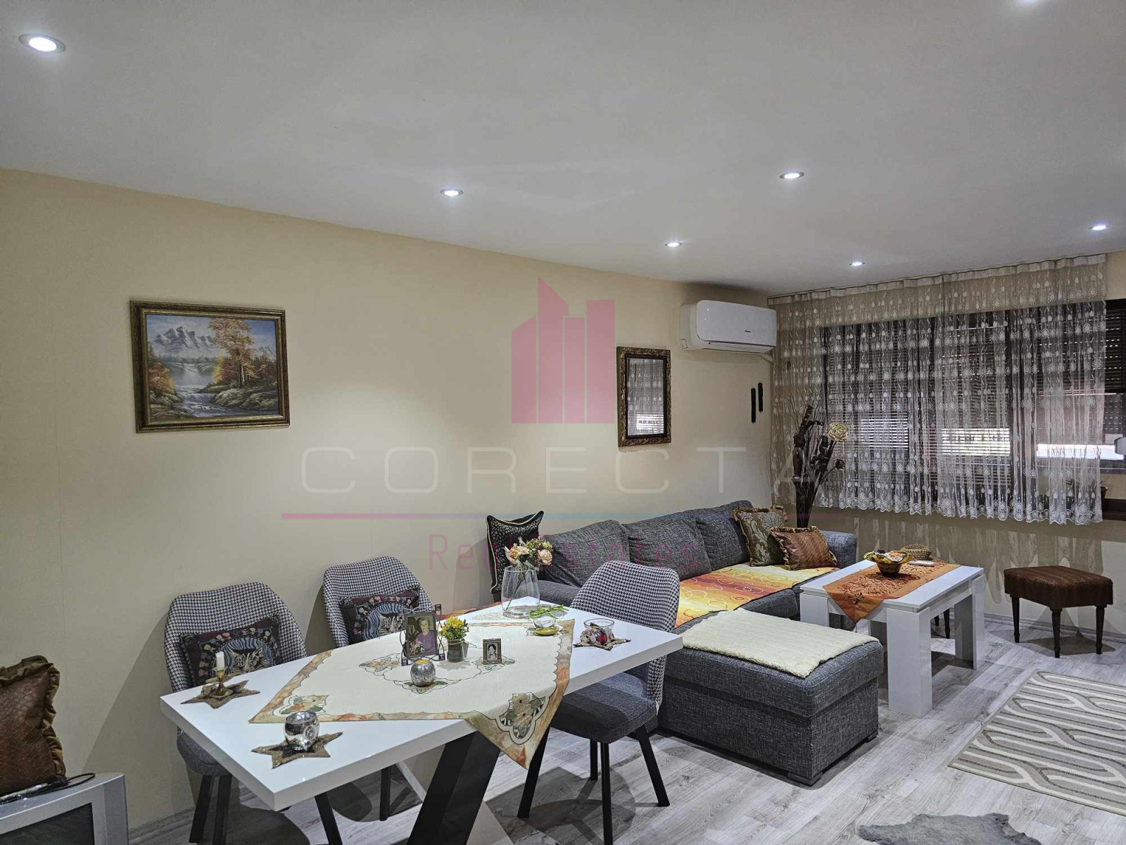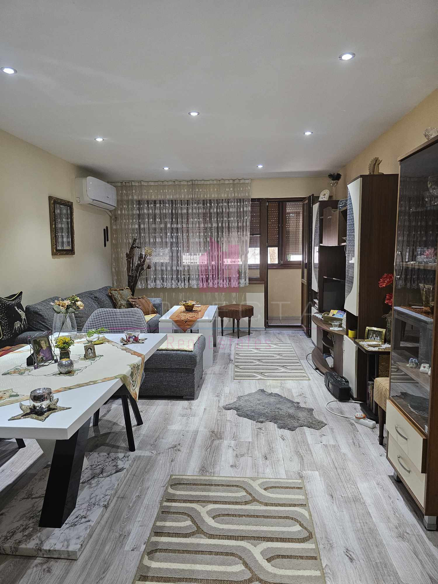 КОРЕКТА ЕСТЕЙТ има удоволствието да Ви представи изключително уютен, тристаен апартамент, находящ се на тихо и спокойно място, в район с много зеленина, в близост до училище и детска градина. Жилището е разположено на първи етаж в панелен блок и е със следното разпределение: кухня, голям хол с преход към детска стая, спалня, двойна остъклена тераса, Г- образен коридор, баня с тоалетна и втора по-малка тераса към кухнята. Направен е качествен, основен ремонт, като ВиК и ел.инсталациите са подменени, дограмата навсякъде е PVC, интериорните врати са от МДФ, поставена е блиндирана входна врата, кухнята е с вградени електроуреди (фурна, стъклокерамични котлони, аспиратор, хладилник,) стените са с