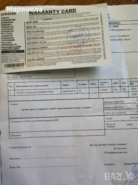 Телевизор QLED Samsung, купен преди два дни. С фактура, с гаранция. Размер на диагонала 165 см.