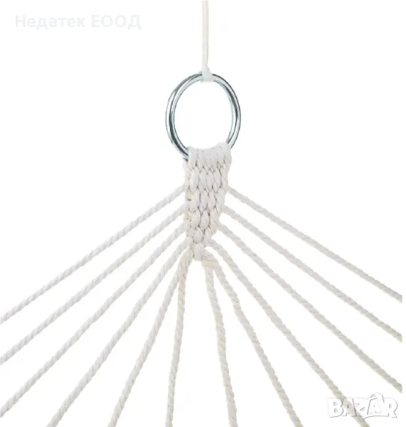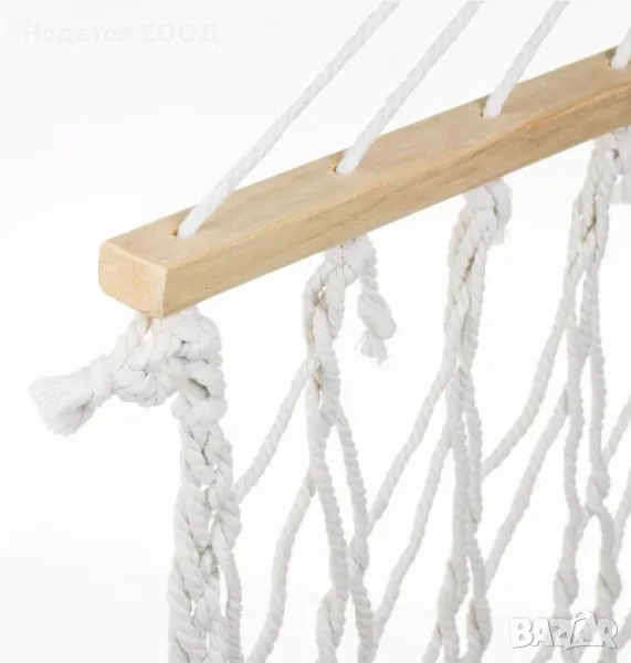 Висящ хамак в бежов цвят с памучно въже и макраме дизайн. Има дървени опорни пръти.