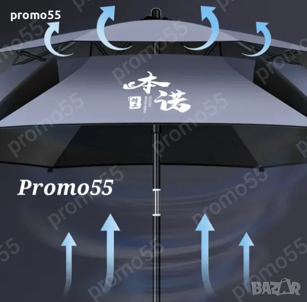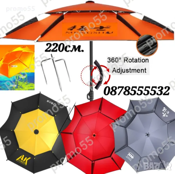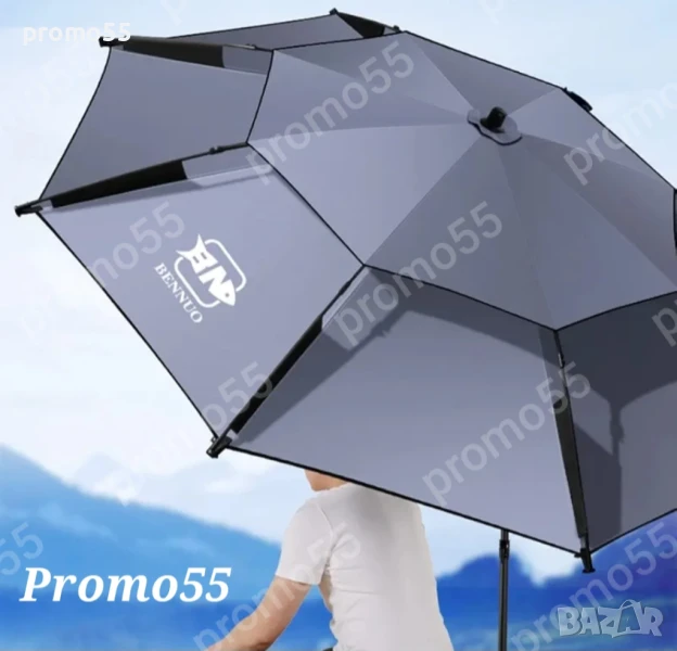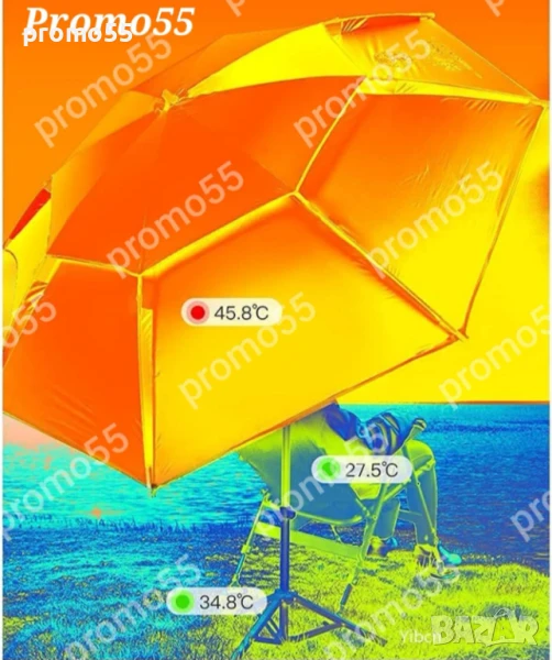 Чадър за Риболов 220см. Плажен Чадър Двоен Покрив, Стабилност при Вятър