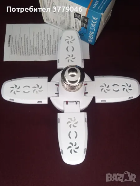 Мини Led лампа. Мощност 28 W. Цвят 3000 K. С възможност за промяна на ъгъла на луминесценция - перките могат да се събират вижда се на снимките. Диаметър на кръга 6,5 см. Дължина в разгънат вид 20 см. С оригинална кутия и инструкция за употреба.