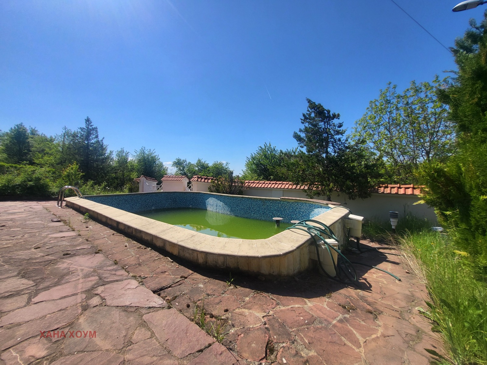 На двора има басейн с размери 6/4 м; беседка; алеи, покрити с плочи и зелени площи с вечнозелени дървета и храсти.