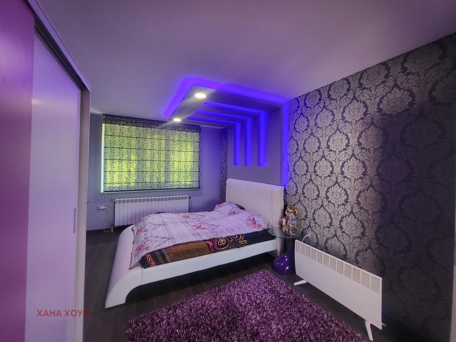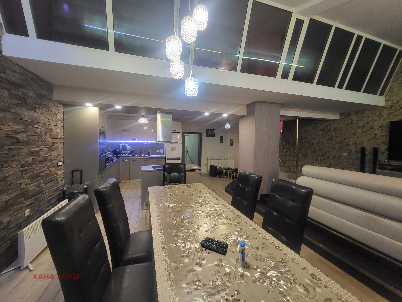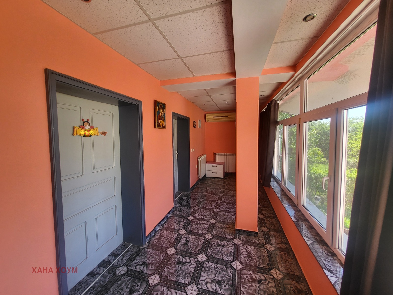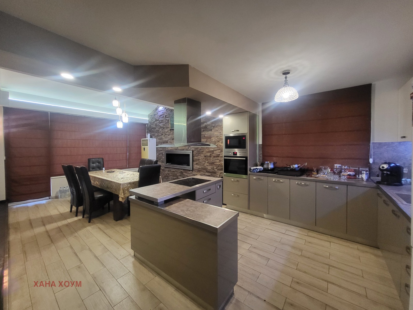 Отоплението е с климатици и парно, а в трапезарията има декоративна камина на ток.