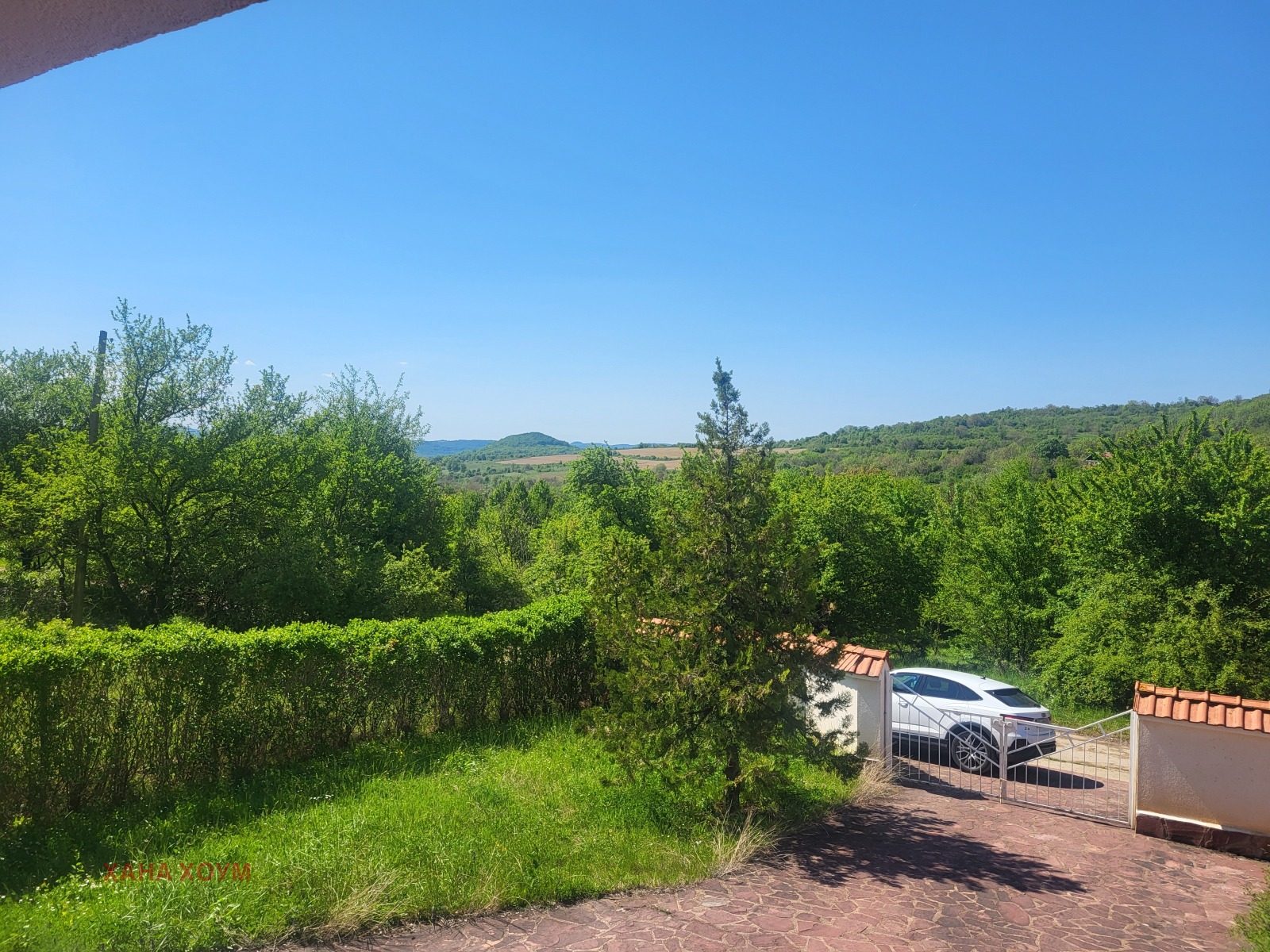 Отделено е от пътя с тухлена ограда и голяма порта. Има място за паркиране на автомобили както пред имота, така и вътре в него.