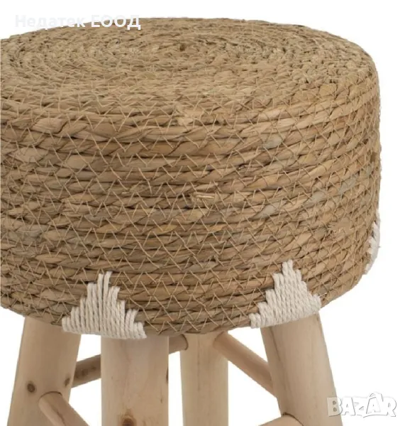 Декоративна дървена табуретка с 4 крака (свързани заедно за по-голяма стабилност) и седалка с бежов плетен калъф и дизайн от памучен шнур.