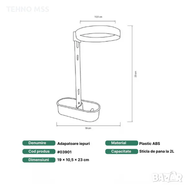 Държачът за пластмасови бутилки е с вместимост до 2 литра и е разположен вертикално надолу с помощта на система, която може да се прикрепи към клетката.