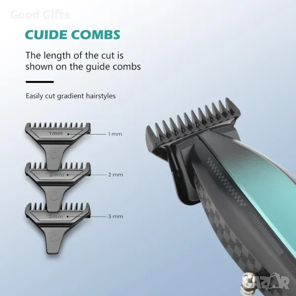 Машинката се зарежда за 2.5 часа и осигурява до 240 минути работа. В комплекта ще откриете 3 гребена (1мм, 2мм, 3мм), масло, четка и кабел за зареждане, както и стабилна поставка.