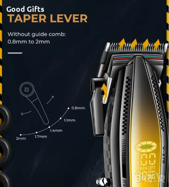 VGR V-270 е професионална машинка за подстригване с впечатляваща скорост от 9000 оборота в минута и модерен дизайн. Снабдена с LED дисплей, тя предоставя информация за нивото на батерията и текущите обороти. Остриетата са с керамично и DLC покритие за по-дълъг живот и максимална прецизност при подстригване. Подходяща е както за лична, така и за професионална употреба.