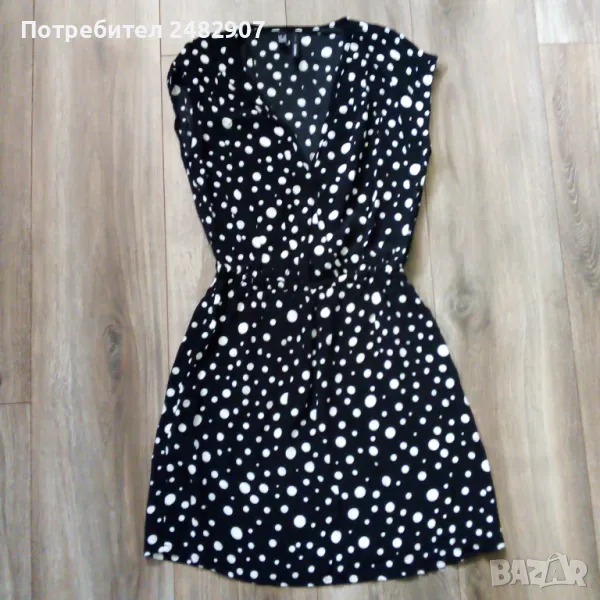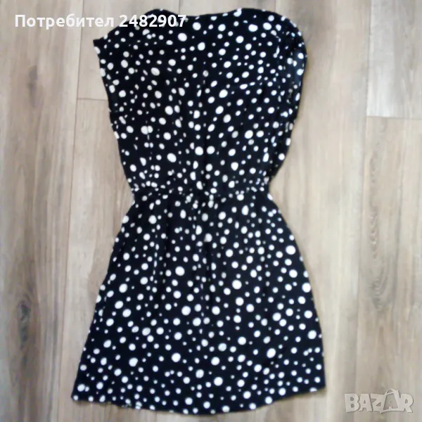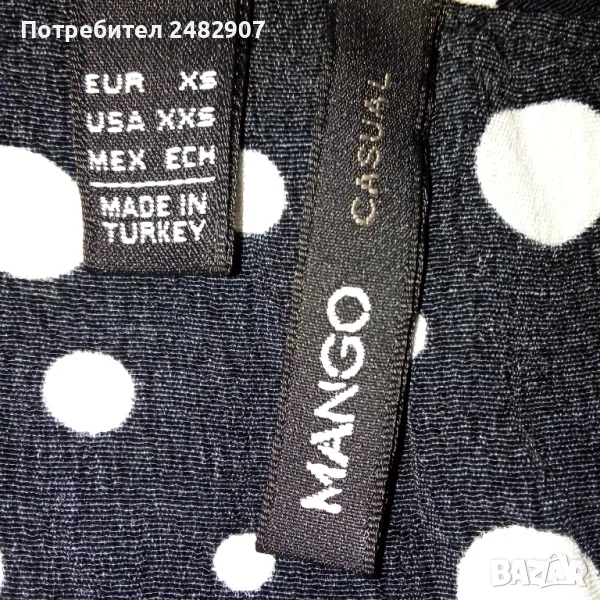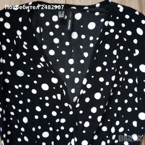 Черна дамска рокля MANGO на бели точки, размер XS. Съдържа 100 % вискоза. Ширина в раменете - 46 см, ширина под мишниците - 45 см, ширина в талията - 29 см, ширина в долната част - 54 см, дължина от рамото до долу - 81 см. Много запазена, почти не е използвана, тънка, с ластик в талията.
