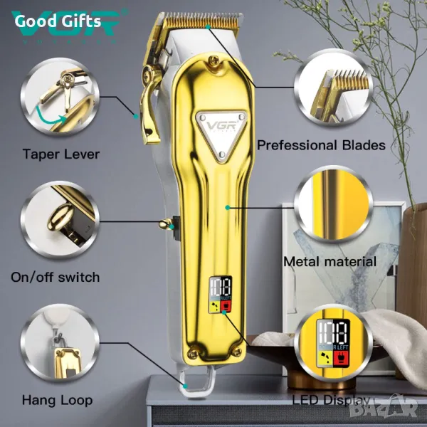 С вградена батерия от 2500mAh, VGR V-140 предлага до 300 минути безжична работа с едно зареждане. LED дисплеят показва оставащия заряд, а страничният лост (taper lever) позволява фино регулиране на дължината на рязане между 0.8 и 2 мм.