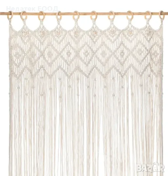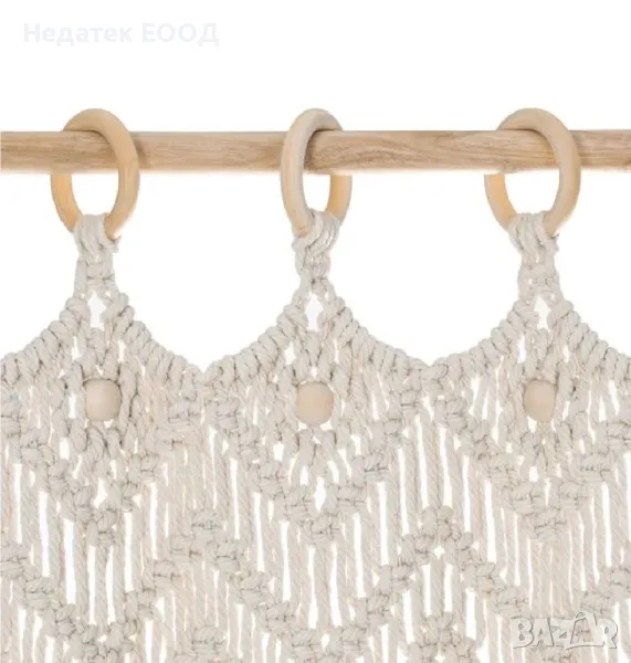 Макраме завеса за врата с дебел памучен шнур, шарка отгоре 25 см, дълги ресни 75 см, дървени мъниста и пришити дървени халки Ø6 см (вътрешен диаметър на халката Ø4 см). Заедно с дървения прът Ø2смx1м, на който можете да окачите завесата. Това е декорация, която придава екзотичен щрих както на интериора, така и на екстериора на вашия дом!