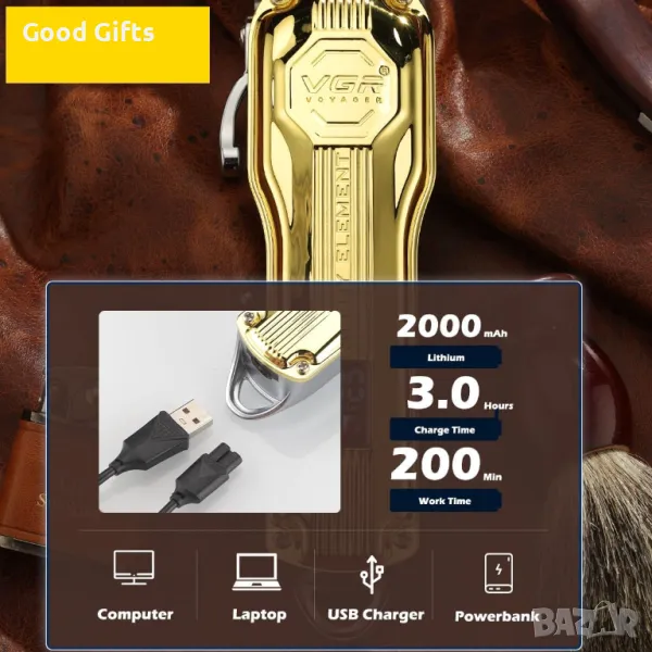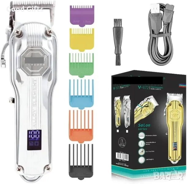 Професионална машинка за подстригване VGR V-672 с мощен мотор и елегантен метален корпус в златист или сребрист цвят. Снабдена с висококачествени самонаточващи се остриета от неръждаема стомана и регулируем лост за прецизно рязане. LED дисплеят показва оставащия заряд и състоянието на работа. Батерията с капацитет 2000mAh осигурява до 200 минути непрекъсната работа с едва 3 часа зареждане. Подходяща както за професионална, така и за домашна употреба.