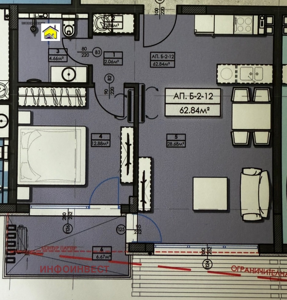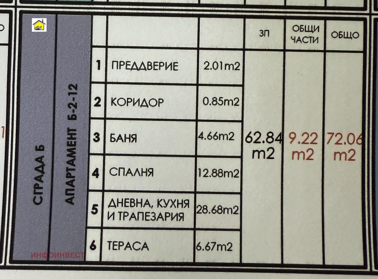 Двустаен апартамент, състоящ се от вх.антре, дневна с кухня, спалня, баня с тоалетна и балкон. Площ - 71,71кв.м