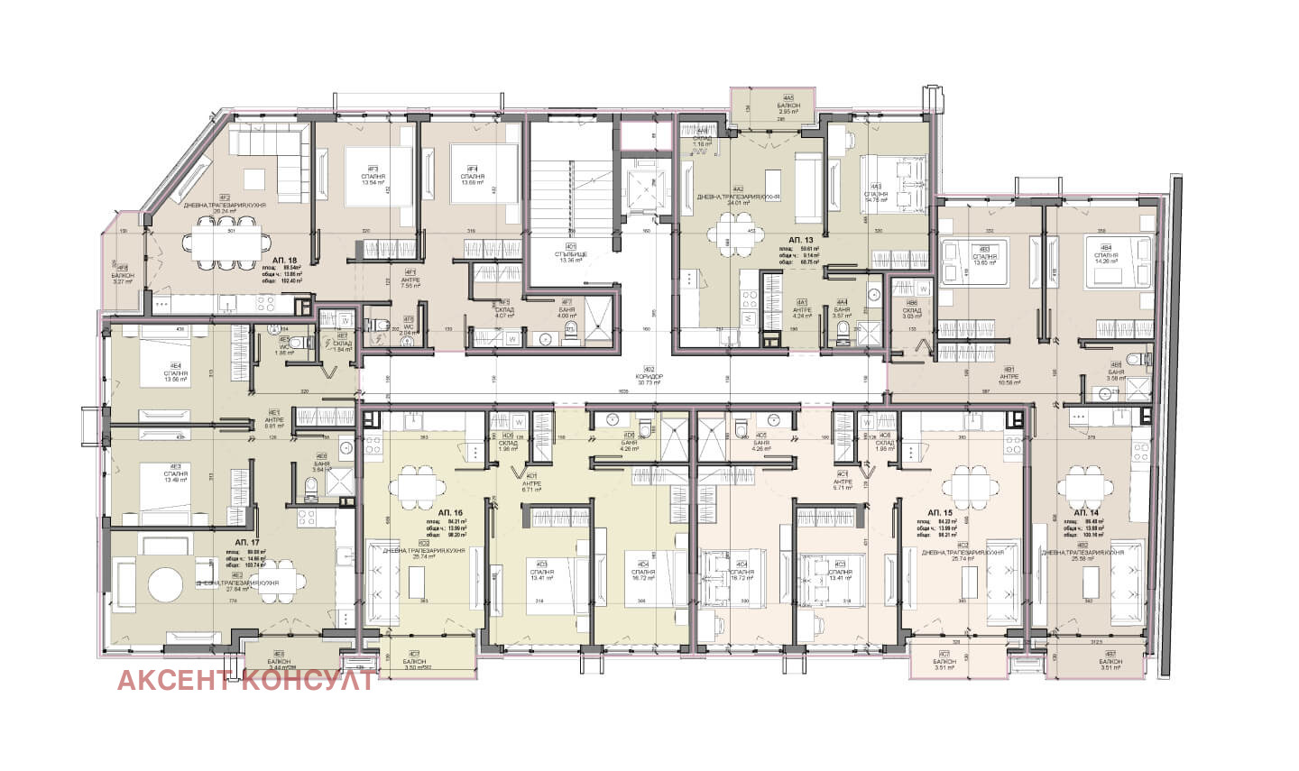 Ап.21 етаж 5, с обща площ 97,40 кв.м., чиста площ 84,22 кв.м., изложение югоизток, двойна височина/мезонет, разпределение: антре, кухня и трапезария, дневна, две спални, склад, баня, балкон.