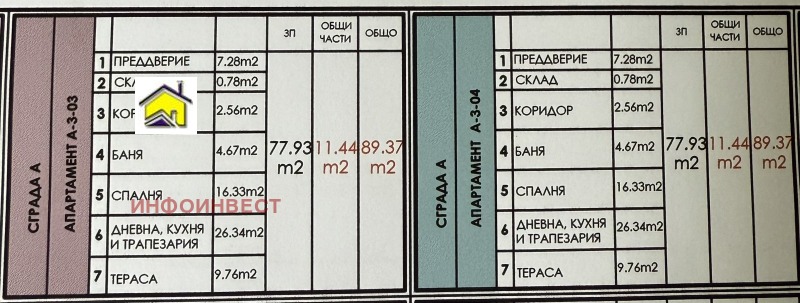 Двустаен апартамент, състоящ се от вх.антре,коридор, дневна с кухня и трапезария, спалня, баня с тоалетна, склад и балкон. Площ - 89,37кв.м