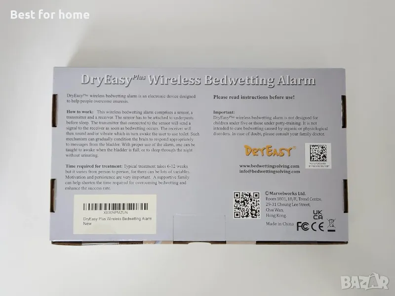Безжичната аларма за нощно напикаване DryEasy Plus е устройство, използвано за обучение на потребителите да реагират на пълен пикочен мехур чрез събуждане. Състои се от сензор за влага с предавател и приемник. Сензорът за влага, който трябва да бъде прикрепен към бельото на потребителя, ще задейства алармата веднага щом се появи нощно напикаване. След това потребителят може да се събуди и да използва тоалетна. Този процес може постепенно да подготви мозъка да реагира на съобщенията от пикочния мехур и в крайна сметка да преодолее проблема с нощното напикаване.