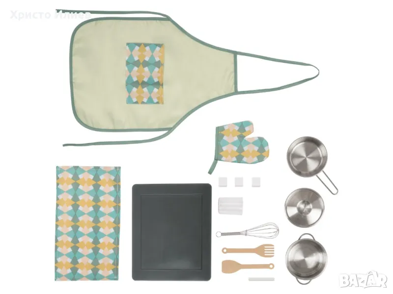 Богати аксесоари: тиган, тенджера за готвене със съвместим капак и за двете, вилица за месо, шпатула и бъркалка, престилка, кухненска кърпа и ръкавица за фурна