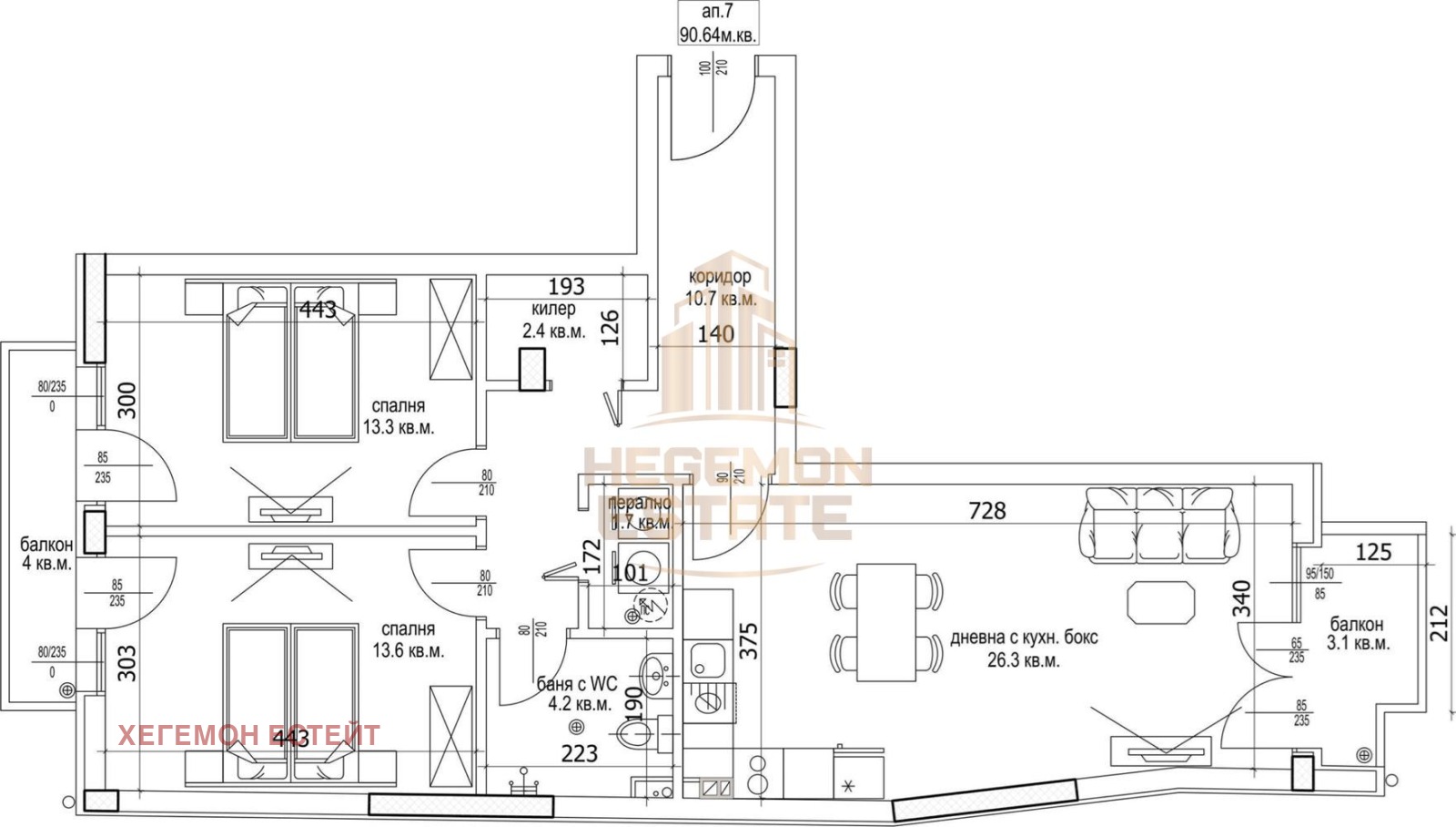 Жилището включва три стаи, две от които са спални, два балкона, баня с тоалетна Допълнително, на разположение имате перално помещение и килер, предоставящи достатъчно място за съхранение.Апартаментът ще бъде завършен по БДС. Има възможност за закупуване на паркоместа.