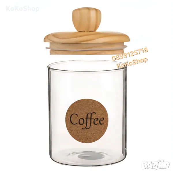 буркан за кафе, стъклен буркан, буркан с дървен капак, кутия за кафе, съхранение кафе, кухненски буркан, аксесоари за кухня, стилен буркан, буркан 700 мл, буркан с надпис