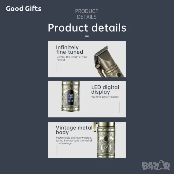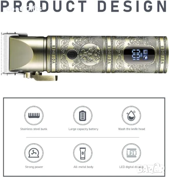 С тази стилна машинка с метален корпус и дизайнерска гравюра ще изглеждате така, сякаш сте излезли от барбър студио – дори и у дома! Вградената LED скала следи всичко важно – заряд, обороти и стил. А цветните гребени в комплекта не само внасят настроение, но и гарантират точната дължина за всяка прическа.