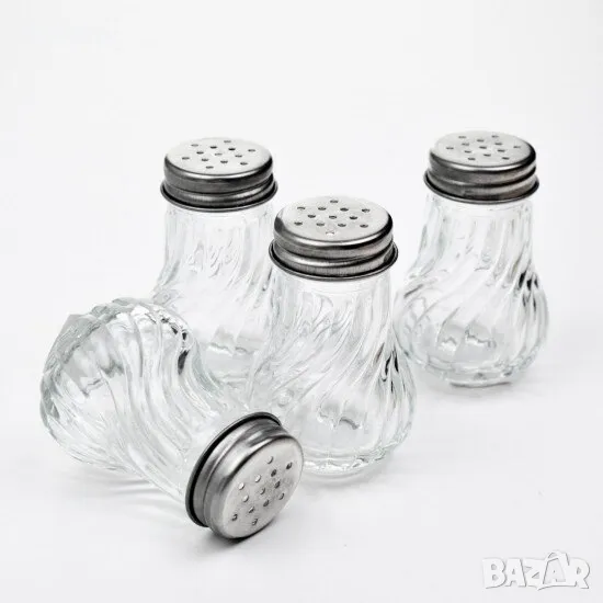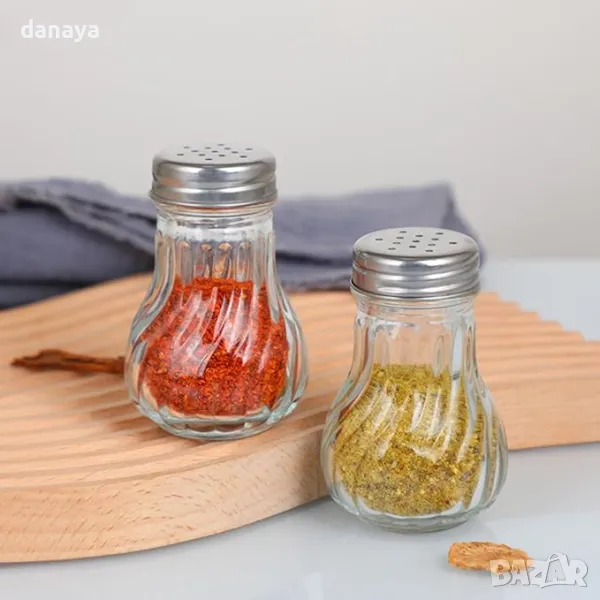 Кухненско бурканче за подправки, стъклена солничка, бурканче за сол и черен пипер.