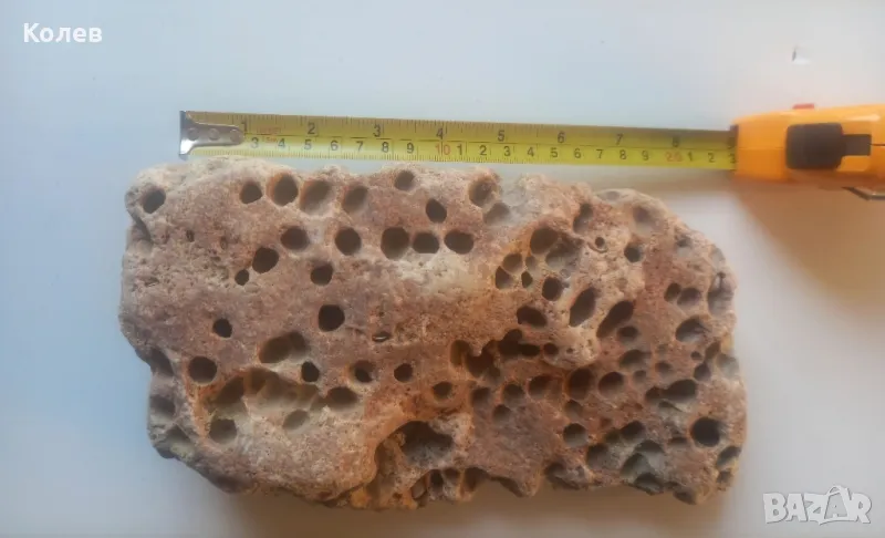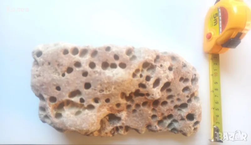 Естесвен морски камък за аквариум с дупки от вкаменелости и естествени вкаменелости на миди и раковини по него с размери 25/12/5 см.