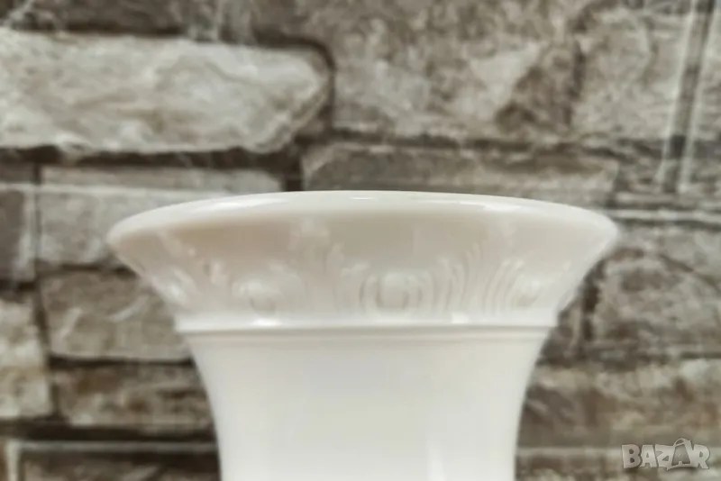 Бяла порцеланова ваза KPM Berlin, изработена в класически стил с изчистена форма и фин релефен орнамент. Отличава се с характерния за мануфактурата висококачествен порцелан и прецизна изработка.