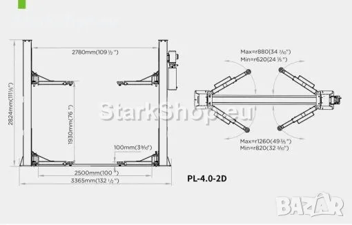 Подемник Двуколонен 4 тона Електрохидравличен RockForce PROFESSIONAL Височина на повдигане от 100 – 1930 mm