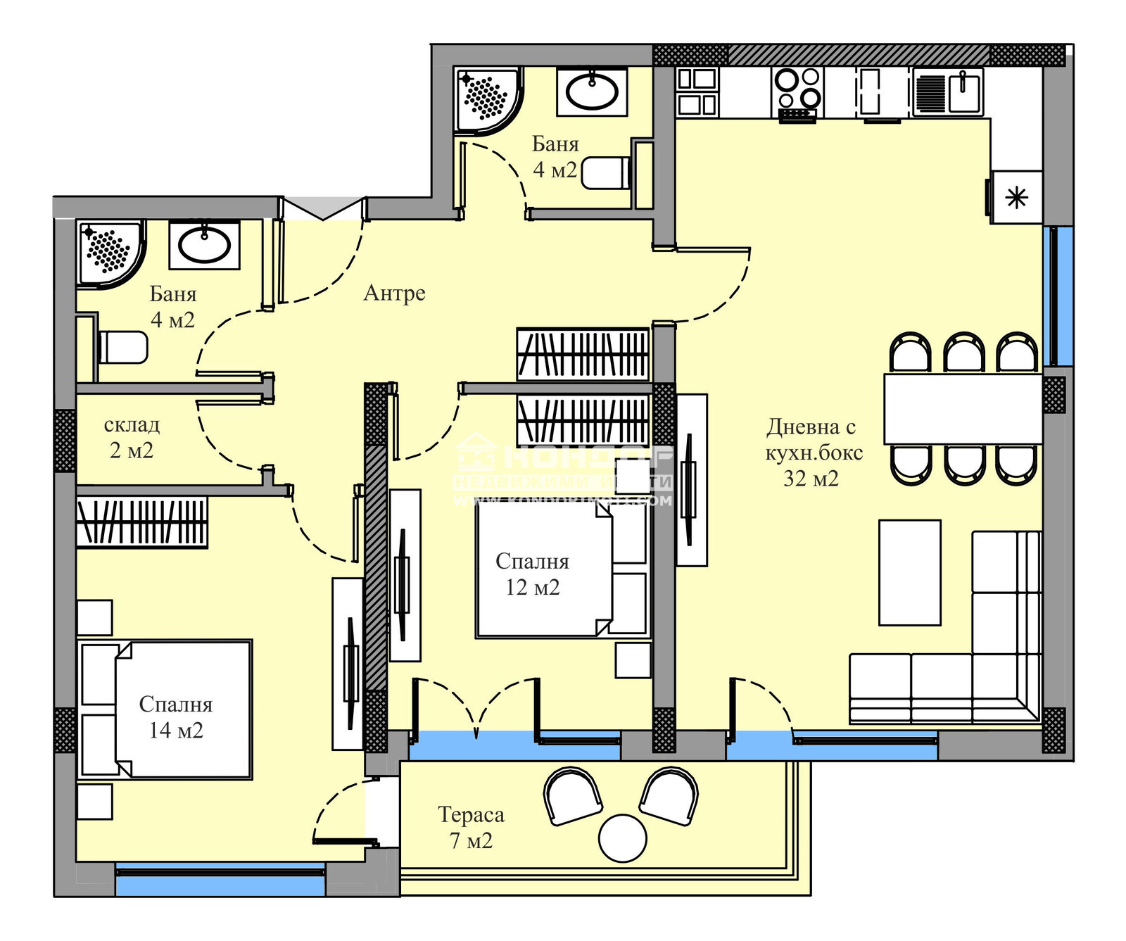 АПАРТАМЕНТ: Просторен тристаен апартамент с добри размери на стаите. Разпределение: широко входно антре, перално помещение, ъглова дневна 32кв.м. с трапезария и кухненски бокс, две самостоятелни спални: детска 12кв.м. и родителска 14кв.м., две бани с тоалетна и една обща тераса.