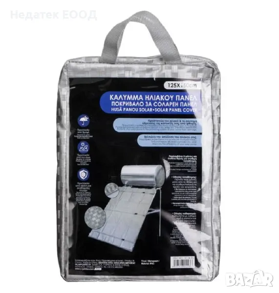 Покрийте панела на слънчевия бойлер и водната система на вашия дом от повреди. Калъф, изработен от здрав PVC с 3 ленти и примки за сигурно закрепване. Той предпазва панела от дъжд и слънце, както и от прах или птичи изпражнения и подобрява производителността на вашия слънчев панел. Лесно се почиства с чиста вода, мек сапун и гъба. Не използвайте силни почистващи препарати. Предлага се в практична чанта тип куфар.
