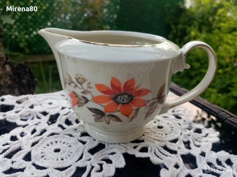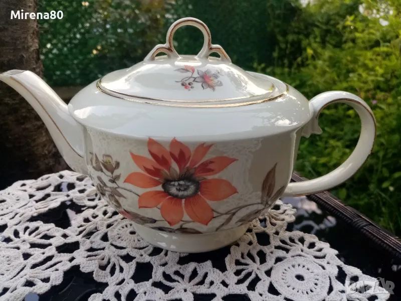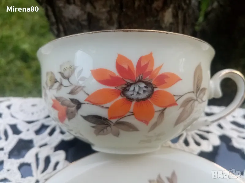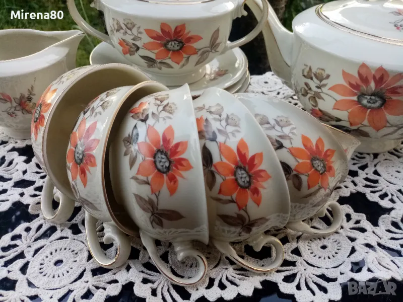 Представям ви един разкошен сервиз, произведен в Германия преди около 80 години. Супер фин, лек порцелан, не се усеща в ръката, с флорален декор в оранжево, което се комбинира прекрасно с цвета на порцелана (екрю) и запазения златен кант. Невероятен на живо ! Без никакви забележки, като нов.