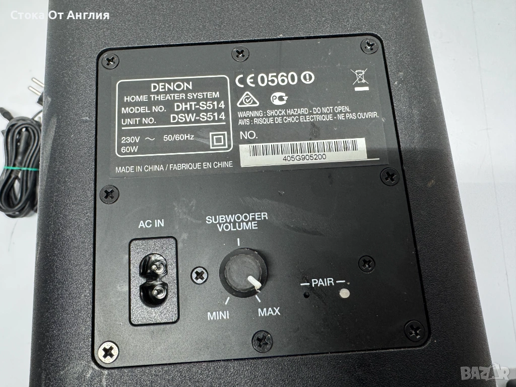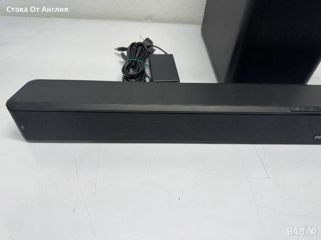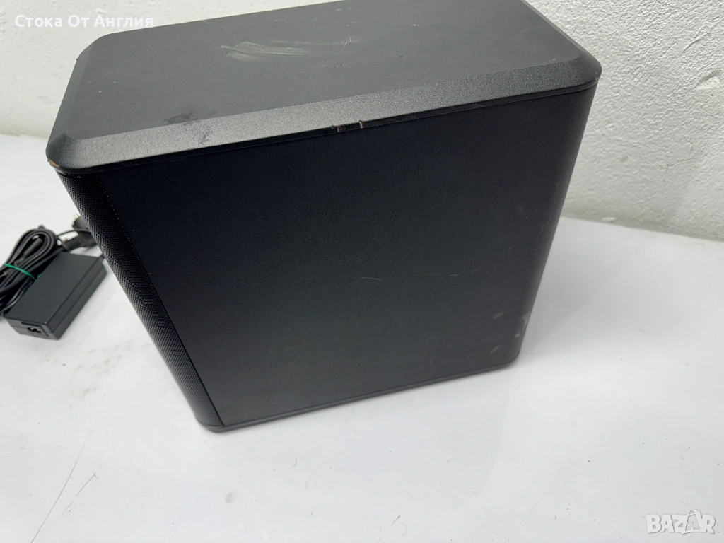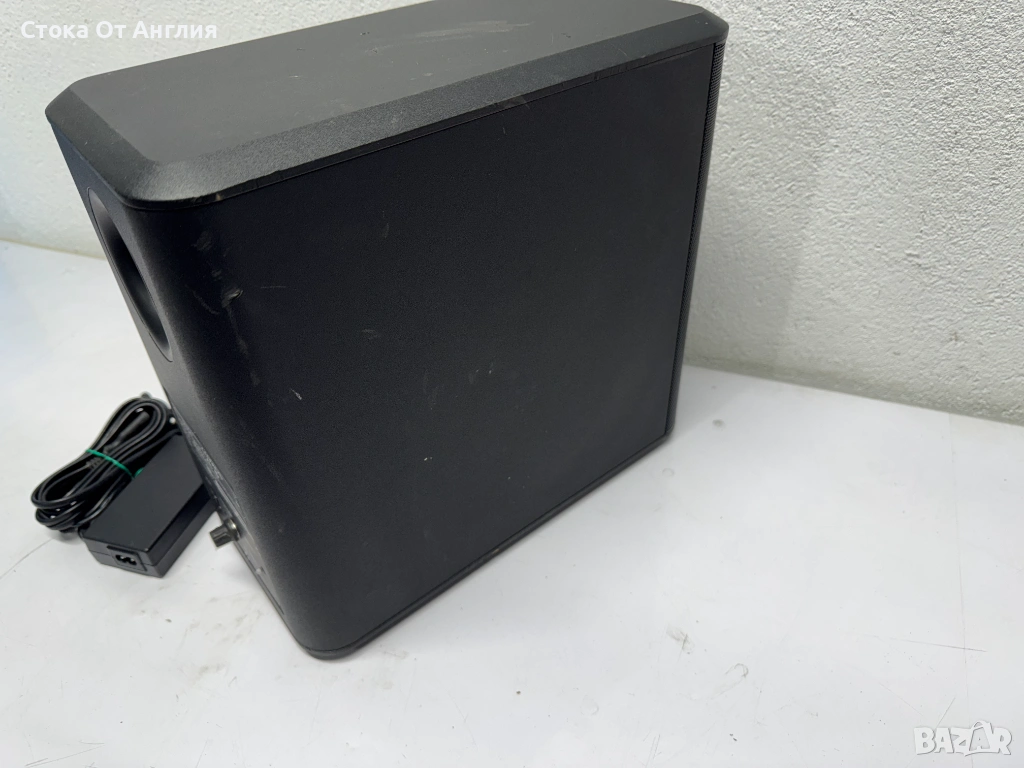 Субуфер: Безжичен модул с два 5.25-инчови говорителя, който осигурява дълбок бас и може да се поставя хоризонтално или вертикално.