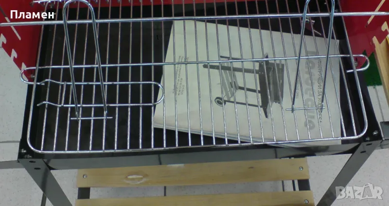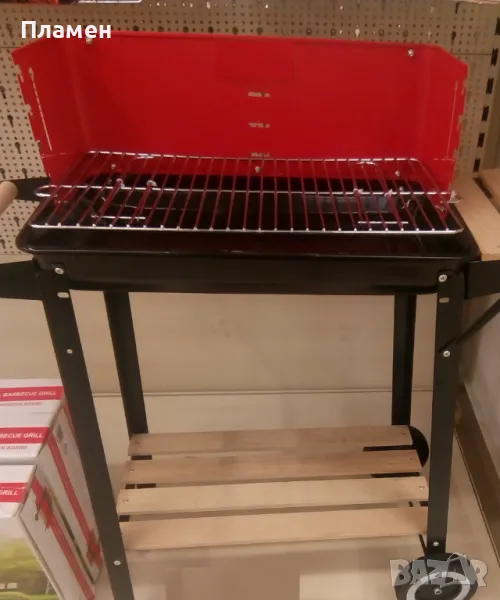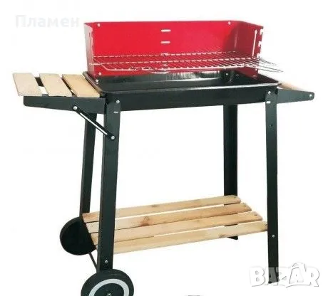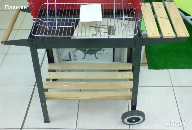 Представлява количка с дървени рафтове и скара