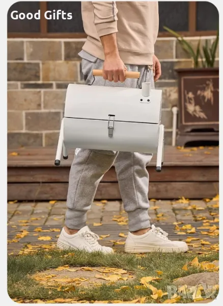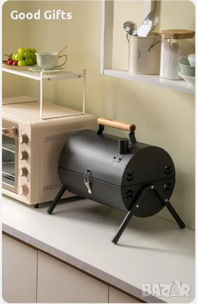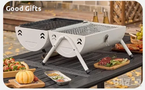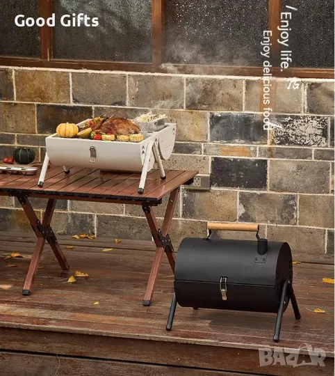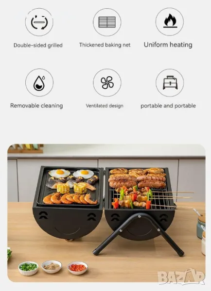 Наслади се на вкусна скара където и да си! Това стилно, преносимо барбекю с оригинален двустранен дизайн предлага стабилна метална конструкция с тръбни крака и удобна дървена дръжка за лесно пренасяне. Разполага с 2 решетки за печене, 2 тави за въглища и специална тавичка за печене на яйца, зеленчуци или месо.