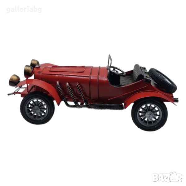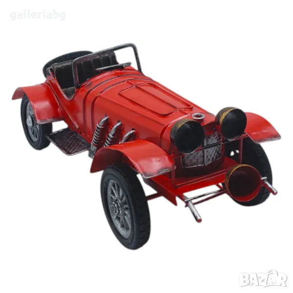 Реплика на стара кола, изработена от червен метал, украсена с черни, златни и сребристо-сиви аксесоари.