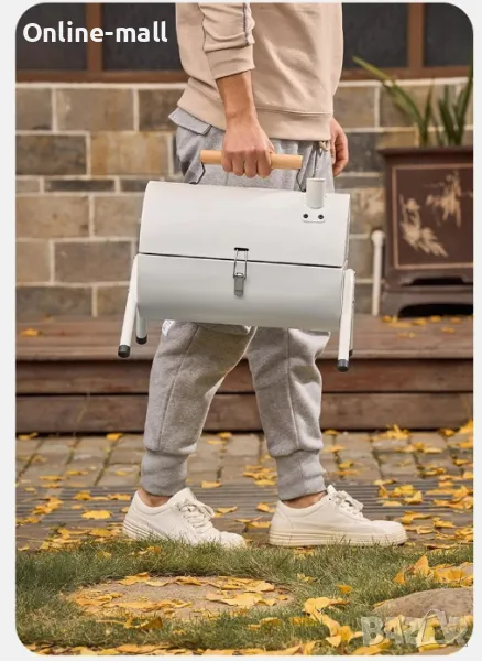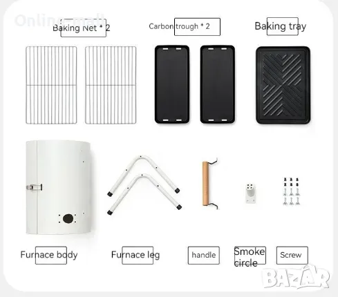 Комплектът включва: Барбекю тяло, крака, решетки, тави за въглища и храна, винтове, дръжка и димоотвод.