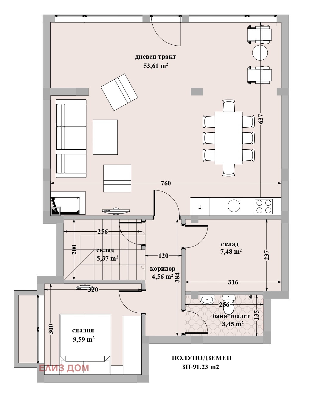 1-во ниво: самостоятелен етаж (91кв.м) в основата на къщата с топла с топла връзка подходящ за второ домакинство или зона за развлечения (фитнес, билярд, механа), състоящ се от дневен тракт 54 кв.м с излаз към двор, спалня с английски двор, баня-тоалет, стая за склад или сауна, машинно помещение.