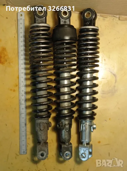 оригинални задни амортисьори за скутер Хонда от 2006 година , свалени от работещи мотори , стават за много други марки и модели скутери, обща дължина 325 милиметра, разстояние между горен и долен болт 300 милиметра, горен болт с дебелина 10 мм, долен болт с дебелина 8 мм , възможен бартер за стари ретро мотоциклети или части за тях с доплащане