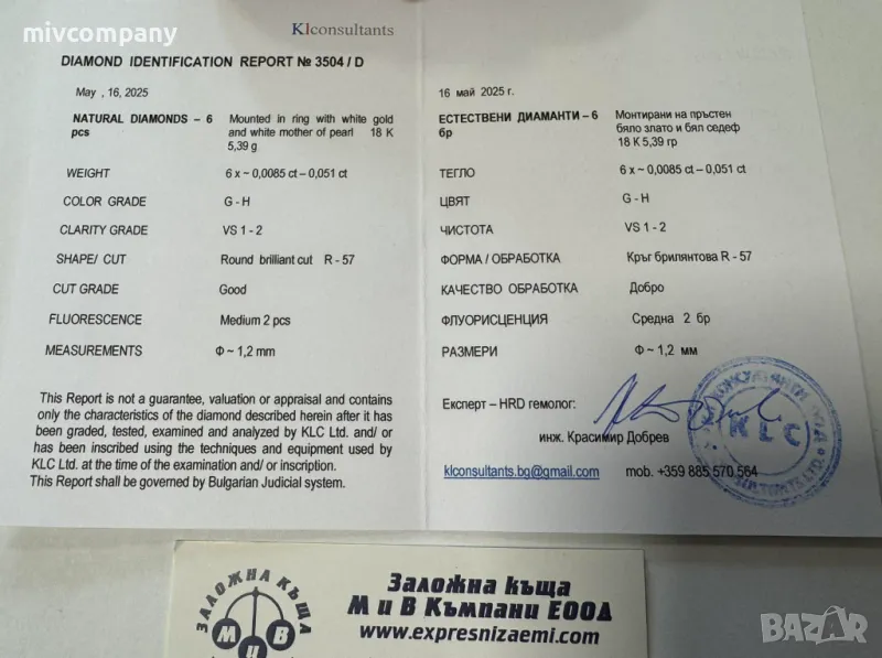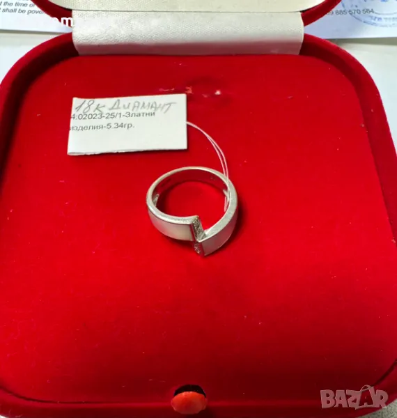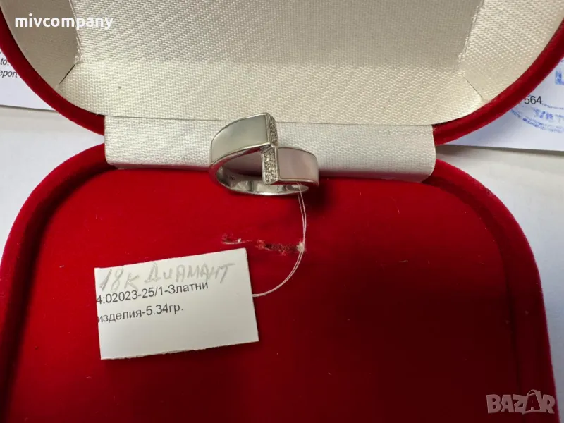 Златен пръстен с диамант. Изработен от бяло злато. В комплект със сертификат за качество и автентичност.За повече информация за каратите на диамантите може да видите на сертификата от снимките.
