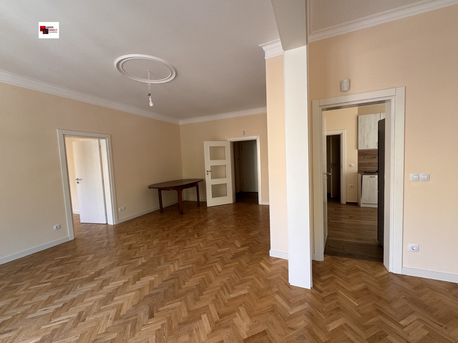 Апартаментът е след извършен цялостен ремонт с най-високо качество, подменени инсталации, ВиК, отделно окабеляване на всички помещения, изцяло реставриран естествен паркет, гранитогрес Marazzi, латекс Oikos, дограма Salamander, входна врата Dierre и нови интериорни врати. Разпределение: входно антре с г-образен коридор, просторен хол с голяма трапезария, с преход към отделно голямо кухненско помещение, обзаведено с поръчкова кухня. Всички уреди са чисто нови, като има и вградена миялна машина. С достъп от кухнята се намира мокро помещение с пералня. В апартамента има луксозна и фунционална баня с тоалетна, втора тоалетна и вграден бойлер. Три отделни спални: една преходна от хола и две самостоятелни спални, чието изложение е към ул. Васил Априлов. Изградена СОТ инсталация. Апартаментът се предлага необзаведен, като бъдещият наемател може да го обзаведе в зависимост от индивидуалните си предпочитания, вкус и цели - било то за дом, офис или кантора. Всички помещения са просторни, а архитектурата - впечатляваща. Ако желаете да живеете или да уражнявате своята професия на това колоритно и харизматично място, свържете се с нас. Телефон за контакт: 0888959939.