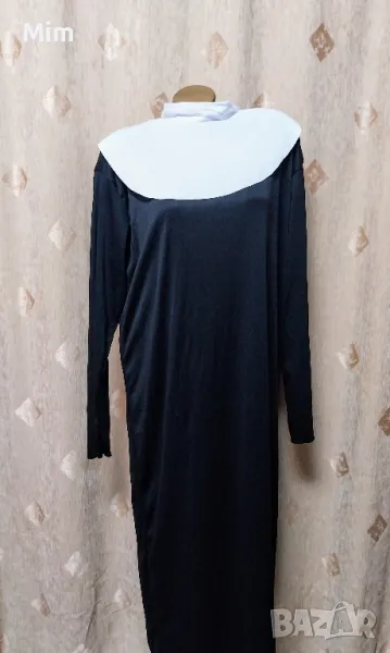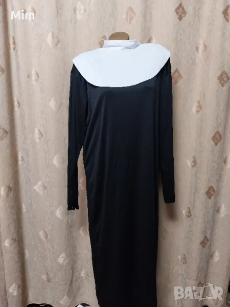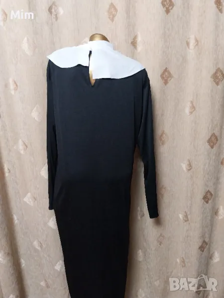 Черна дълга свободна рокля с дълъг ръкав около врата с бяла платка / монахиня / за парти / .Гръдна 70 до 80 см едностранно ,дължина 130 см ,по етикет е М ,предвид размерите в см според мен е за по голям размер. Неразличима от нова без хартиен носител.