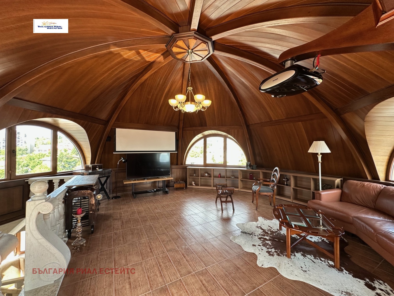 трапезарна част с дизайнерско обзавеждане, кухненски бокс, библиотека и винарна;