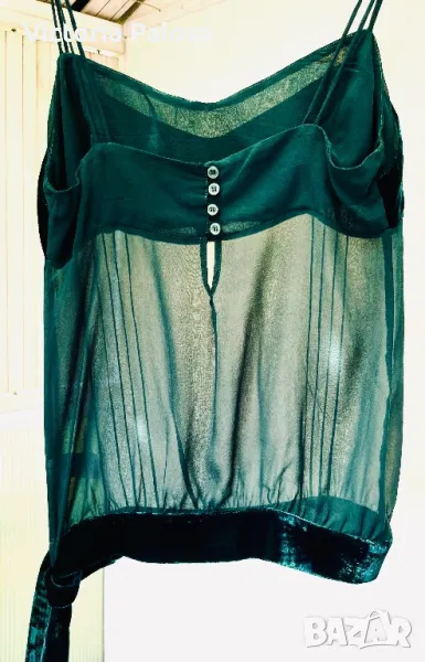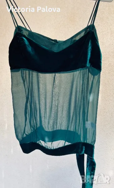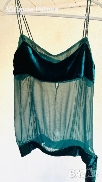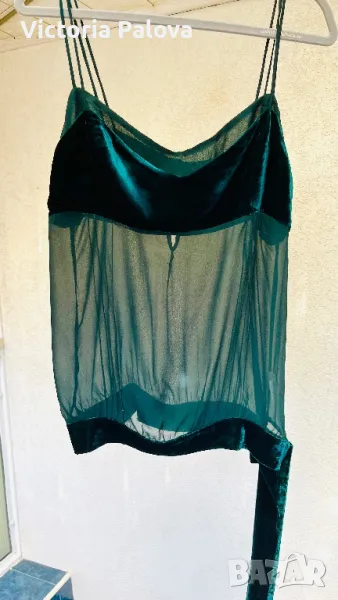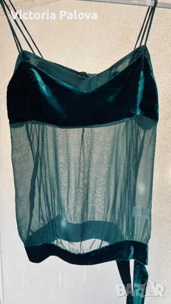 Прекрасна впечатляваща дреха за вечерни мероприятия, много красив цвят и модерно съчетание на различни материи - фактурно кадифе и прозрачна коприна. ГО - 44-46см, дължина без презрамка - 50см.