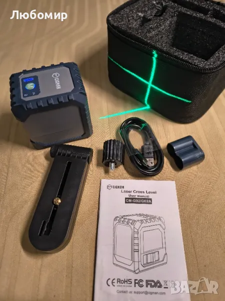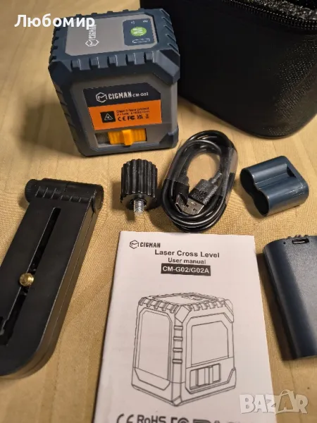 нивелир, акумулаторен, въртящ се на 360°, кръстосан линеен лазерен нивелир.CIGMAN CM-G02 Лазерен нивелир с кръстосани линии. Индикация за изтощена батерия и магнитна скоба: Универсалният лазерен инструмент разполага с магнитна скоба за 360° гъвкаво позициониране. Той е идеален за задачи като полагане на плочки, монтаж на снимки, врати, прозорци, мебели, дървообработване и произведения на изкуството.