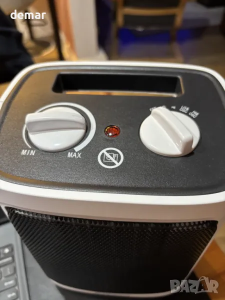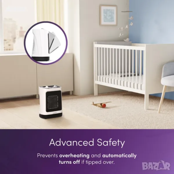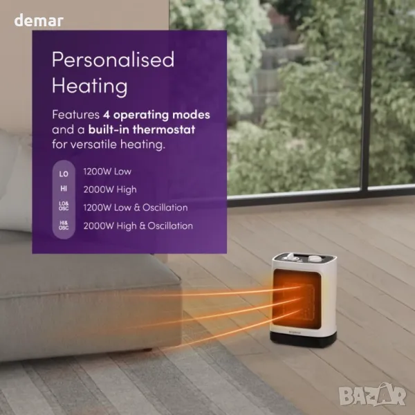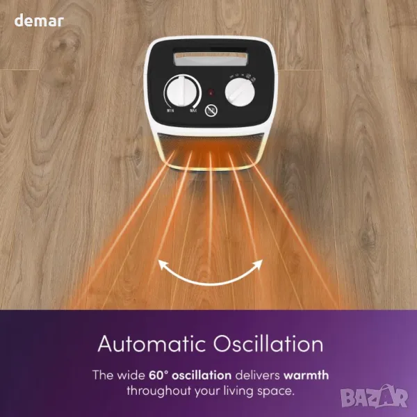 Този отоплителен уред използва керамично нагряване за бързо и енергийно ефективно затопляне и предлага две степени на мощност с 60° осцилация, за да разпредели топлината върху по-големи площи. Регулируем термостат поддържа зададената температура автоматично за постоянен комфорт. Лек и преносим с дръжка за носене, той е лесен за преместване между стаите. Вградените функции за безопасност включват защита от прегряване и превключвател против преобръщане за допълнително спокойствие.