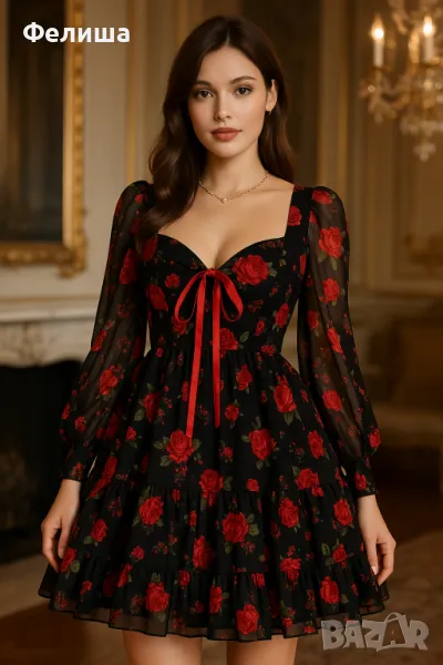 Удивително Красива Романтично Нежна Рокля с Червени Рози