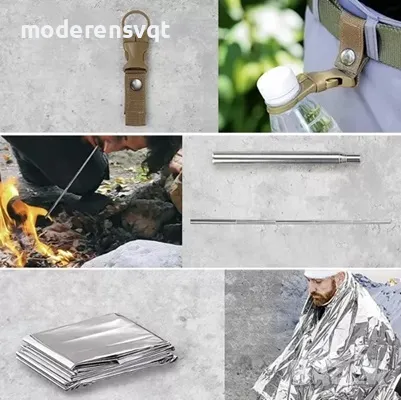 паракордна лента - приблизително 350 см паракорд с компас, свирка и запалка - всичко това под формата на лента за глава, силиконова стръв 2 бр. + корда + 2 куки, най-необходими неща - лъжица с вилица и отварачка за бутилки + нож, сгъваема пламъчна тръба, 2 парчета подпалка , карабинка 2 бр. Това е много голям комплект, който ви позволява да оцелеете в много трудни условия.